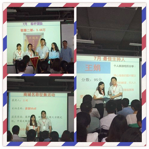 七月的骄阳,如火如荼,把豪放的炙热挥洒大地,但这丝毫没有影响多享同仁们的工作热情,也为我们下半年的冲刺迎来了开门红。本次月会是由多享的人事主管邱建军主持的,向来严正不阿的邱主管主持会议底气十足将会议的节奏控制得井井有条。按照多享惯例,会议第一项是隆重的颁奖典礼,先后颁发了业绩标杆、销售之星、客服之星、希望之星、最佳主持人和商城名称征集奖等奖项,尤其值得鼓励的是来自信贷部的新成员李宗恩,刚来公司一个月,就拿到了月度的希望之星和销售之星两项大奖!请各位同事多多学习!