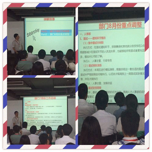 仪式结束之后,便是公司高层领导讲话。首先是发展总监刘总对公司上个月的人事行政工作做了系统的总结指出了工作中的不足并提出了解决的方案,同时也指出了8月份的工作计划。