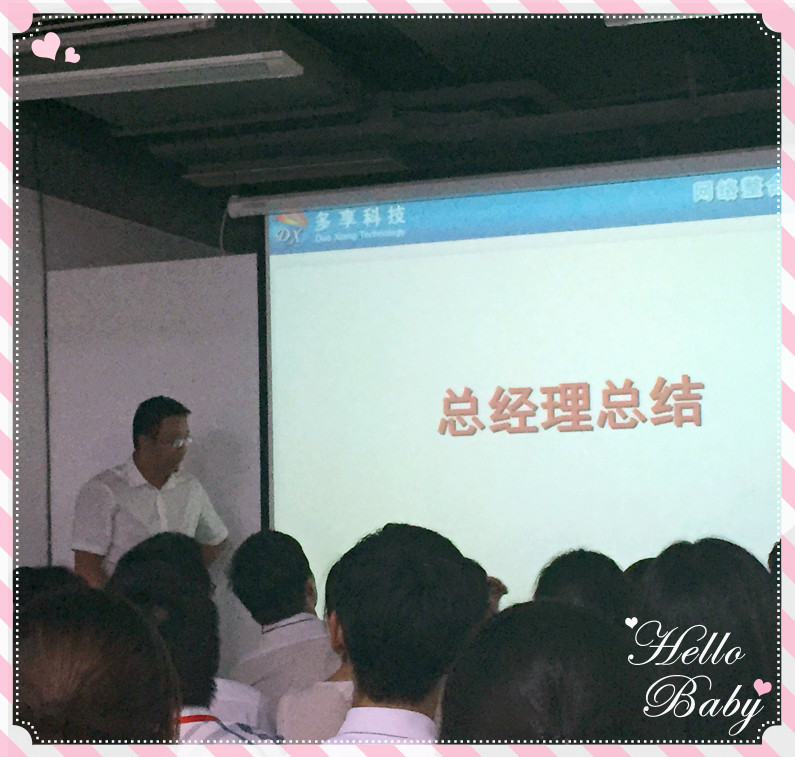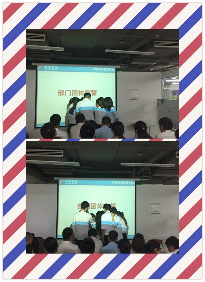 会议最后一项是各部门宣誓,多享的同事们团结一心,把握今天我们任重而道远,展望明天,我们豪情满怀!相信在我们多享同事们的共同努力下,公司的明天一定会更加灿烂!